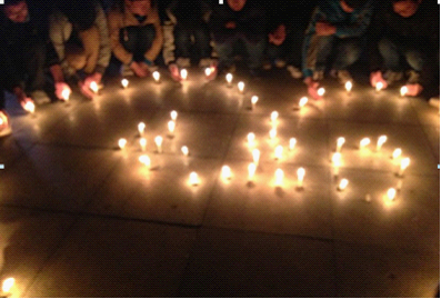 晚8时,各个院系的同学们在达弘毅广场,用手中的蜡烛在地上围成了一个大大的“心”形图案,中间一个“4.20”字。同学们点亮蜡烛,默默祈祷,祝愿四川雅安及其他灾区平安。